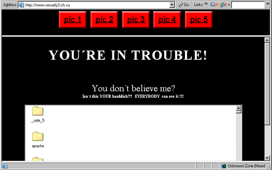 Fasten your seat belts, we're about to take a little trip down Sleazy Marketing Avenue. First stop, the URL in the above message, where we are greeted by a banner ad for a porn website and a repeat of the "YOU'RE IN TROUBLE!" admonishment. ![]() Not too surprisingly, this sophomoric pronouncement is followed by an equally childish prank of displaying the contents of the visitor's C: drive. It's an old trick, but contrary to the statement that "EVERYBODY can see it!!!", the information is only viewable from the visitor's computer, not from the website. You can see an example of this trick in the commentary for Rumor 21. If it ended here then we could dismiss the whole thing as a prank, but the trip doesn't end here. After a few seconds, the visitor is forwarded to the "Evidence Eliminator" website where one of several ominous sounding webpages will be displayed... Example 1: